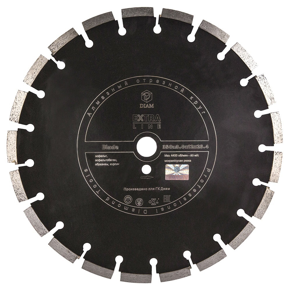 DIAM Extra Line Blade 350x3.0x12x25.4 асфальт - алмазный круг, диаметром 350 мм, изготовлен с использованием лазерной сварки сегментов и с посадкой 25,4 мм для работы в основном на резчиках швов и бензорезах для резки асфальта, асфальтобетона, абразивных песчаников, кирпича. Благодаря высоте алмазного сегмента 12 мм, имеет высокие ресурсные показатели. Работать можно как с подачей воды, так и без неё, что важно при работе при минусовых температурах.