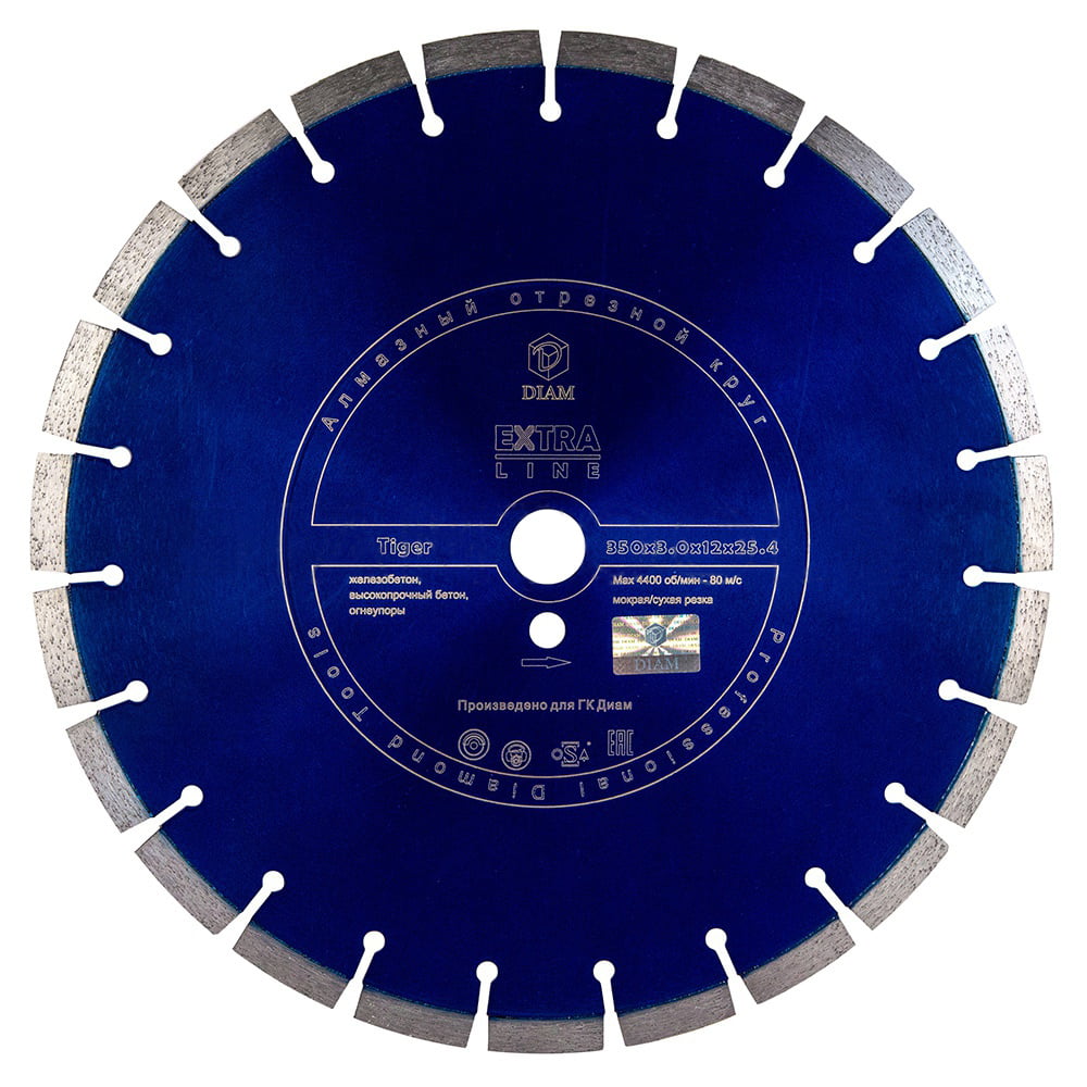 Алмазный диск DIAM Extra Line Tiger 350x3.0x12x25.4 железобетон - предназначен для работы на бензорезах, резчиках швов и другом оборудовании, благодаря лазерной сварке сегментов может работать как в сухую, так и с подачей водяного охлаждения. Увеличенная до 12 мм высота алмазного слоя и новый инновационный состав сегмента увеличивает ресурс до 30 %. Подходит для резки железобетона, бетона, твердых огнеупоров.