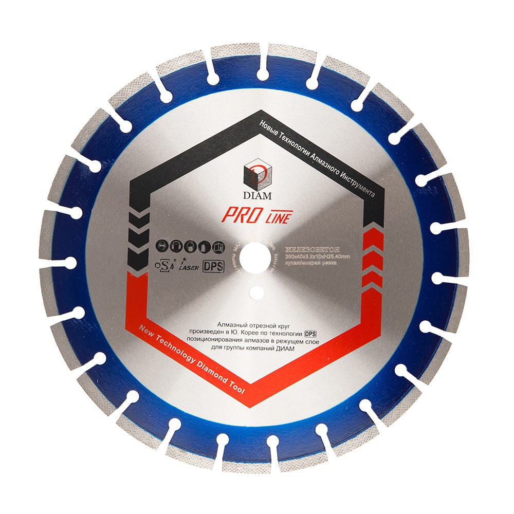 Профессиональный алмазный диск DIAM Pro Line 350x3.2x10x25.4 железобетон предлагается для резки старого высокопрочного бетона, железобетона. Диаметр диска 350 мм.