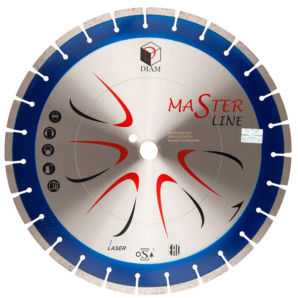 Модель Железобетон Master Line имеет круг диаметром от 125 до 600 мм. 2,0-4,0 мм – толщина алмазного слоя. Сам алмазный слой составляет 7,0-10,0 мм. Размеры посадочного отверстия колеблются от 22,23, 25,4, 32/25,4 до 90/50 мм.