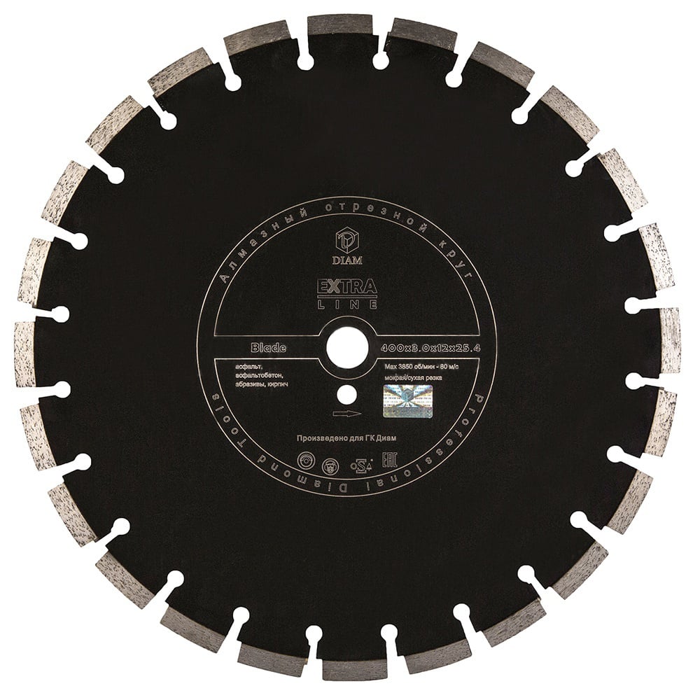 DIAM Extra Line Blade 400x3.0x12x25.4 асфальт - алмазный диск диаметром 400 мм, произведен с использованием лазерной сварки сегментов и высотой алмазного слоя 12 мм. Посадка 25,4 мм для работы в основном на резчиках швов и бензорезах для резки асфальта, асфальтобетона, абразивных песчаников, кирпича. Благодаря высоте алмазного сегмента 12 мм, имеет высокий ресурс. Работать можно как с подачей воды, так и без неё, что важно при работе при минусовых температурах.