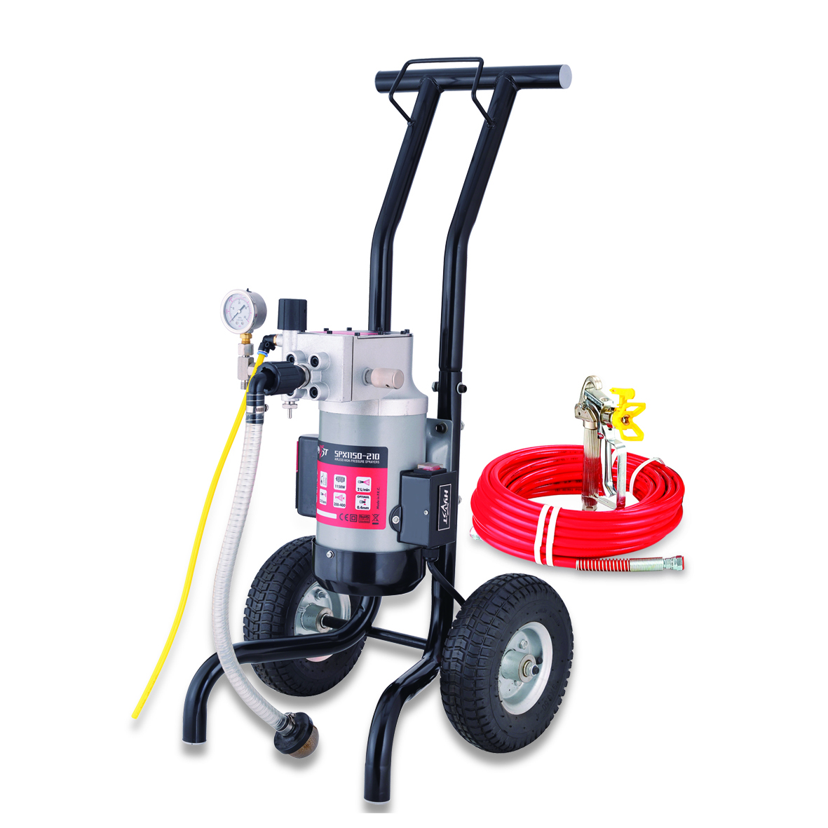 Окрасочный аппарат HYVST SPX 1150-210 – это прибор для проведения окраски поверхностей методом безвоздушного нанесения краски. Устройство получает питание от электрической сети, и забирает материал для работы прямо из ведра, в котором она продается. Распыление происходит через стандартный пульт, куда подается краска под высоким давлением.