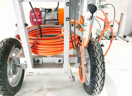 Аппарат ASPRO – 5000RL используется для нанесения дорожной разметки с двумя линиями. При помощи бензинового мотора приводится в движение поршневой насос, работает от бензинового мотора мощностью 6 л/с, при этом он выдает высокую производительность 5 л/мин.