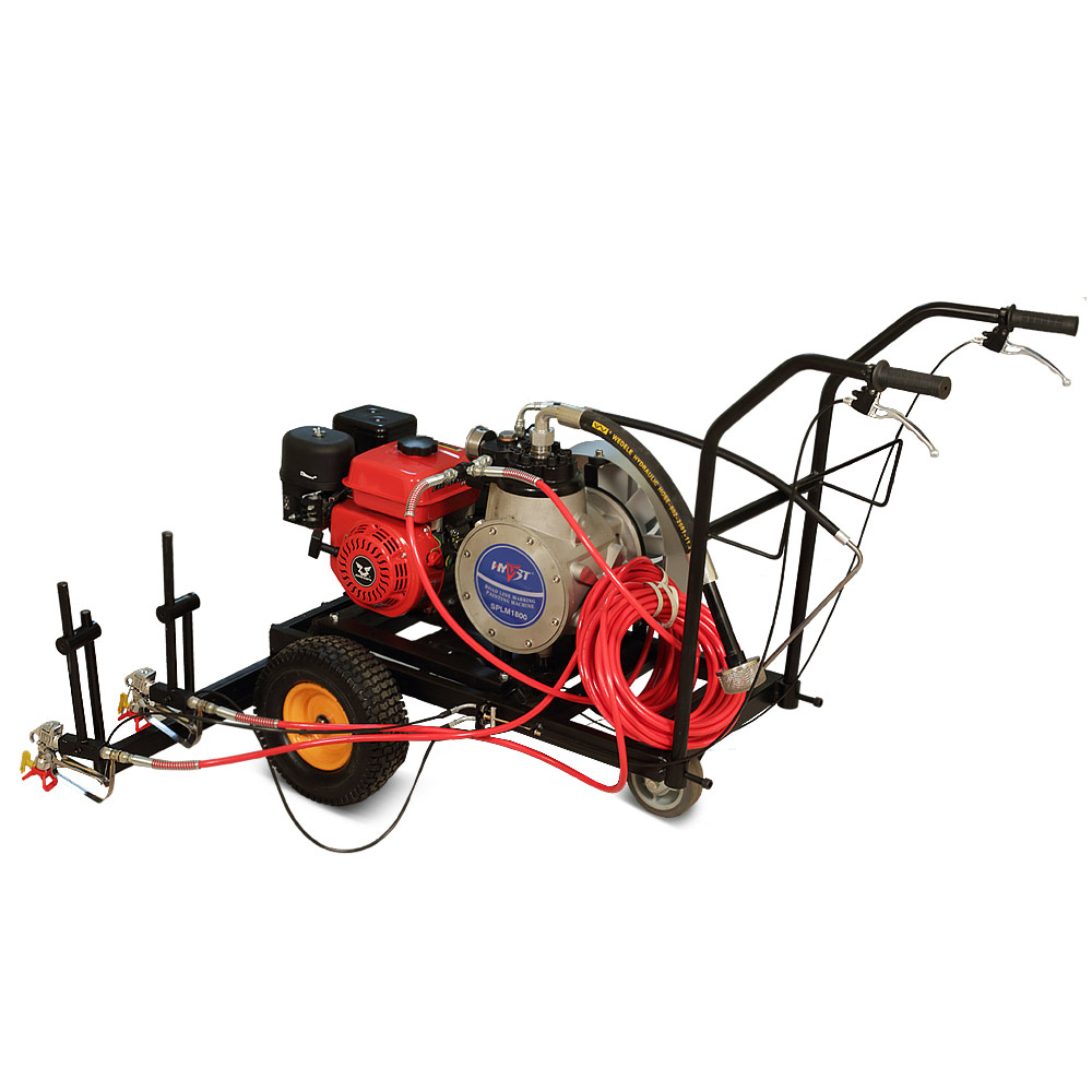 HYVST SPLM 1800 – ручная машина, предназначенная для нанесения дорожной или иной разметки на поверхность. Данный окрасочный аппарат работает по принципу безвоздушного распыления краски под высоким давлением, иначе говоря краска распыляется без участия в процессе воздуха. Такой способ обладает несомненным преимуществом по сравнению с воздушным методом, при котором окрашивание производится «облаком», в данном случае окрашивание идет «полосой».
