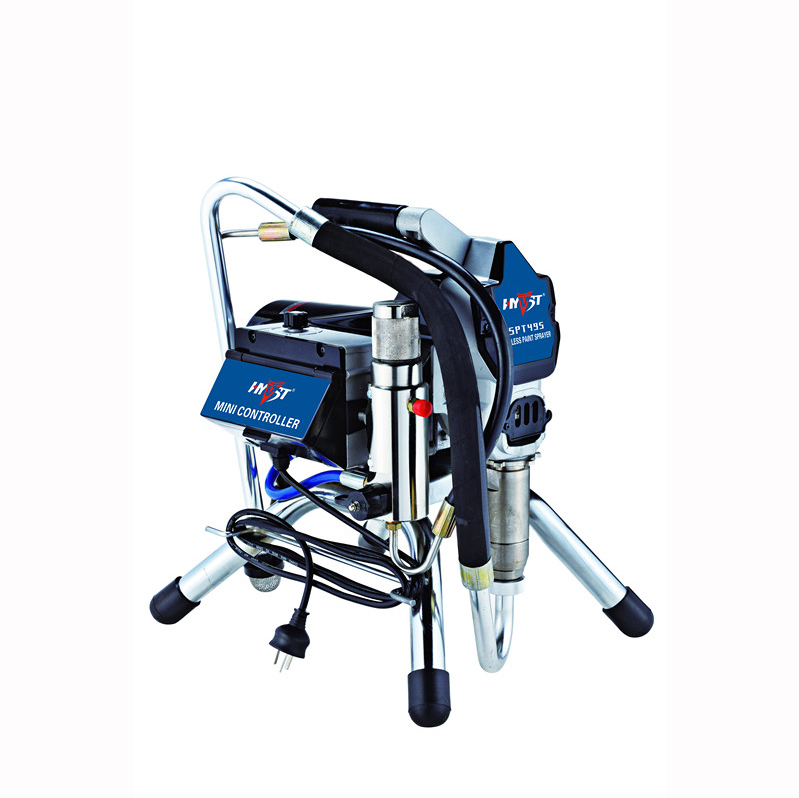 Окрасочный агрегат безвоздушного распыления краски. Работает от электрического двигателя на 220 вольт, засасывает краску из ведра, в котором она поставляется, и подает ее по шлангу в краскопульт для распыления краски безвоздушным способом.