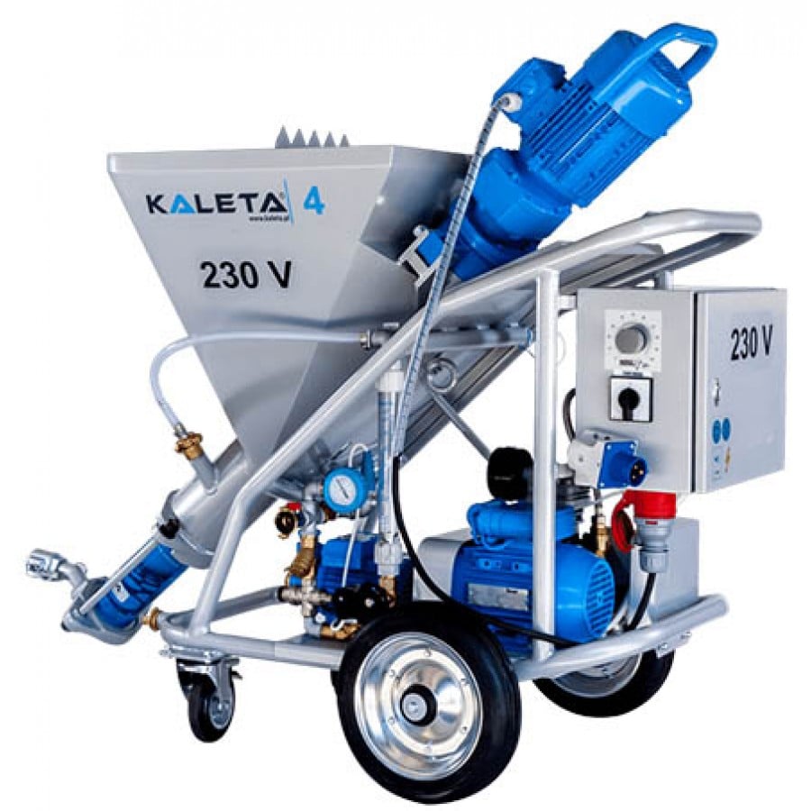 Штукатурная машина Kaleta К-4/230 отличается характерной компоновкой, напоминающей детскую коляску. Кузов (бункер) располагается впереди, панель управления вынесена к ручкам. Габариты невелики, что позволяет использовать машину в ограниченных пространствах.