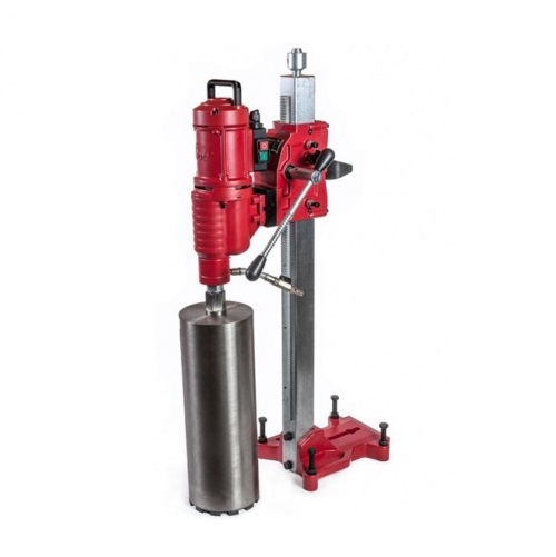 Чтобы оператор в труднодоступных местах управлял установкой дистанционно, предусмотрен PRCD переключатель. Фиксация каретки осуществляется запорным винтом. В место сверления подается вода для исключения перегрева. А для сокращения потерь пусковых токов задействуется соответствующий ограничитель. Установка комплектуется стандартным креплением коронок 1.1/4".
